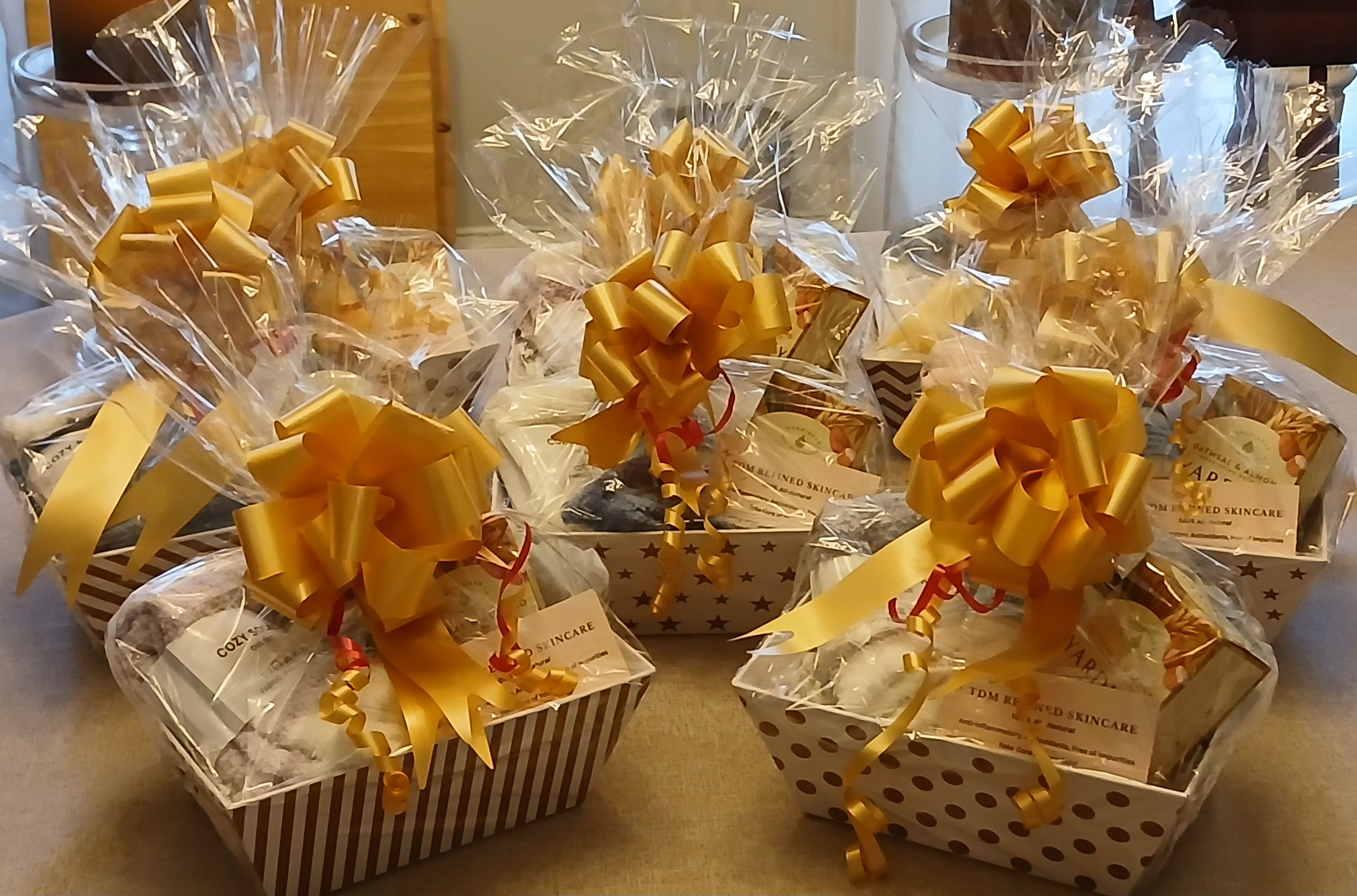 This beautiful 8" x 6" x 3" basket with handles is made with quality thick cardboard that is sturdy and resistant to breakage or deformation. The theme of the basket promotes a healthy skin experience by including one 4oz body butter of your choice for moisturization, one oatmeal/almond soap bar for a soothing wash, one loofah scrub for exfoliation, and one pair of cozy sockets! It comes with crinkle paper in the bottom, a clear plastic cover, and a nicely sized gold bow around the top!
